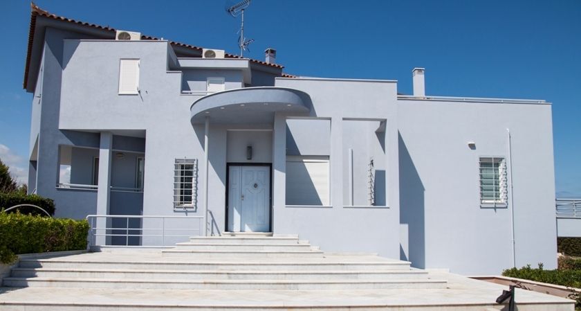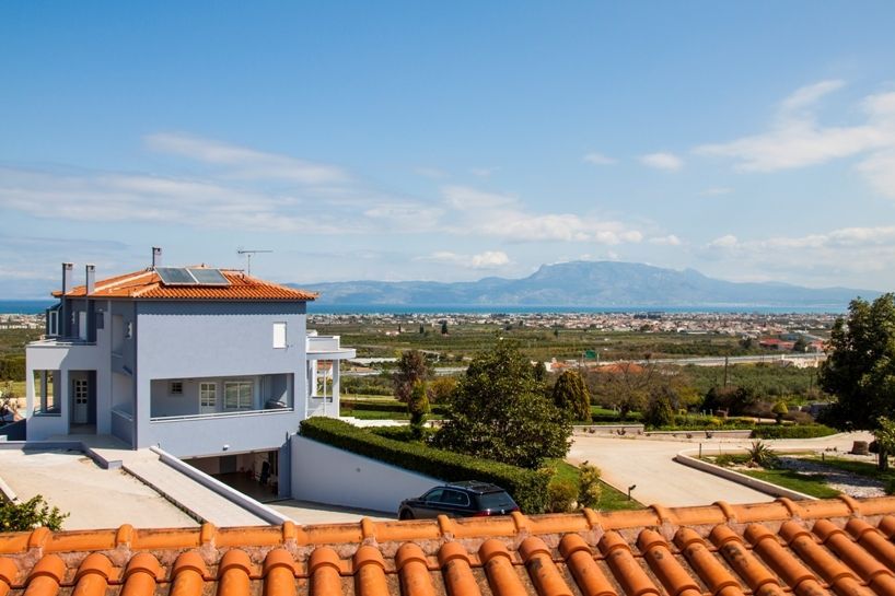 Στο υπερυψωμένο ισόγειο (χώρος υποδοχής, μεγάλη κουζίνα, τεράστιο σαλόνι με εξοπλισμό οικιακού κινηματογράφου, τραπεζαρία για 10 άτομα), 2 μεγάλα μπαλκόνια με θέα στη θάλασσα και την ακρόπολη της Κορίνθου.
