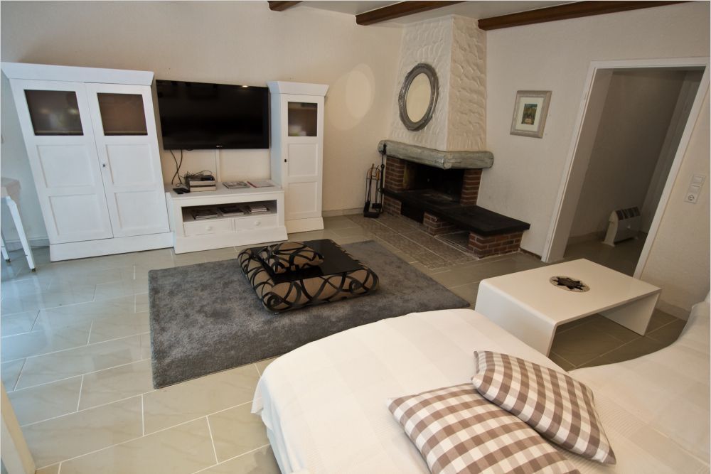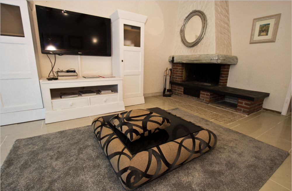 Το ευρύχωρο σαλόνι με ένα ζεστό τζάκι βρίσκεται στο κάτω χωρο του σπιτιου με άμεση πρόσβαση στη βεράντα και στον κήπο.