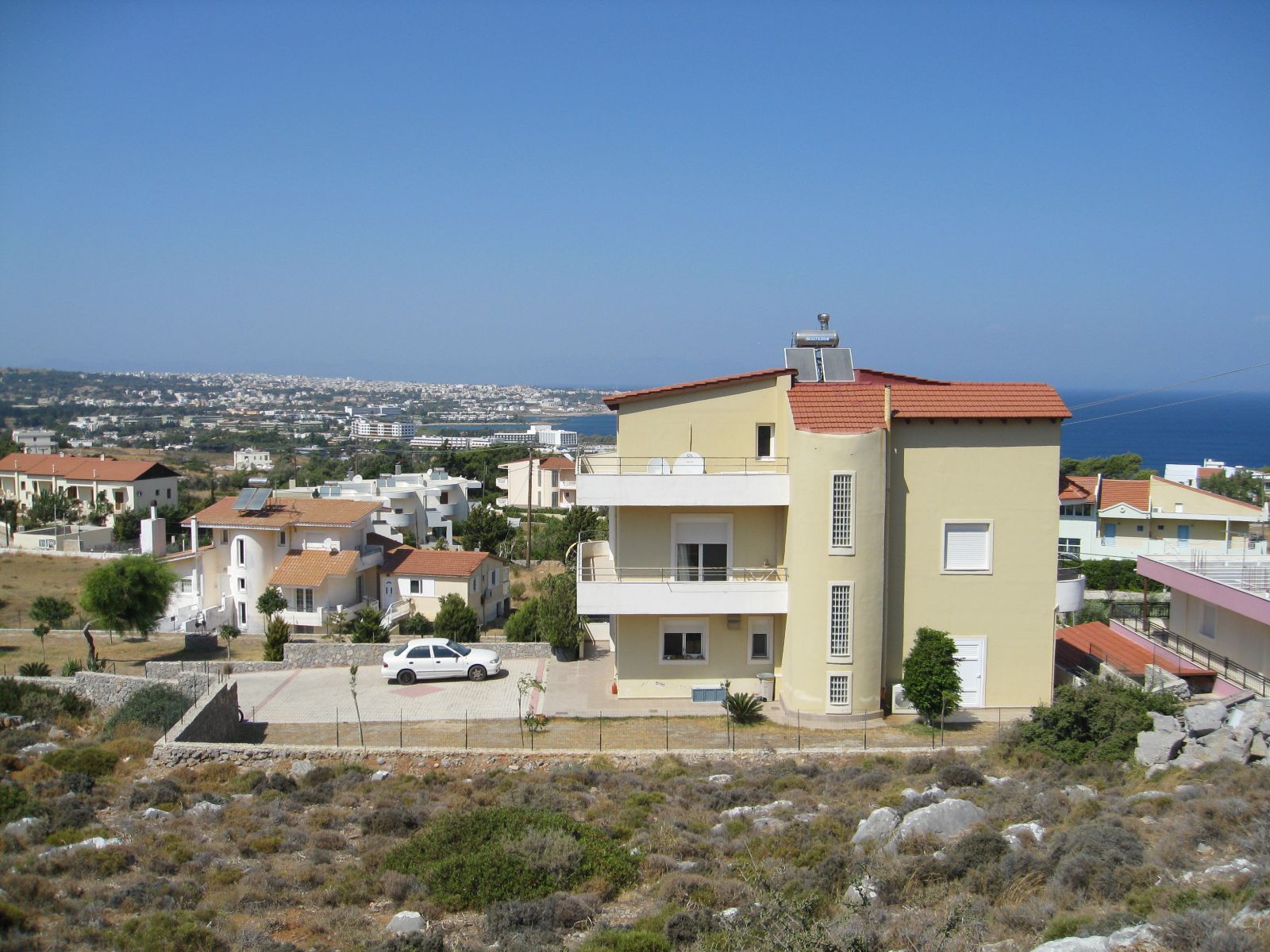 Η Μονοκατοικία βρίσκεται στα προάστια της πόλης της Ρόδου, 750 μ. από τη θάλασσα, σε απόσταση 3 χλμ. από τον αστικό ιστό, σε πολύ ήσυχη, ασφαλής μια περιοχή, ιδανική για οικογένεια με μικρά παιδιά, στην περιοχή της Καλλιθέας, με απεριόριστη θέα στη Θάλασσα στο σύνολο της πόλης της Ρόδου.