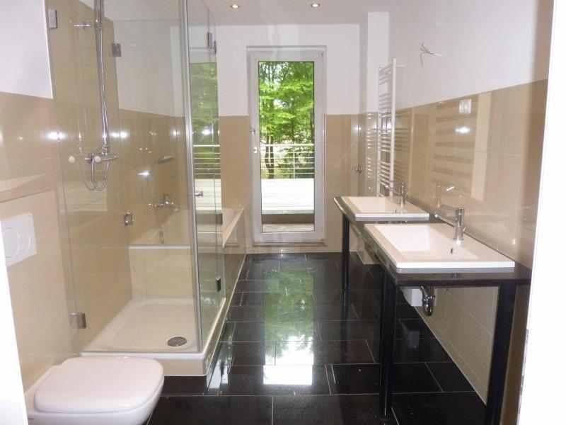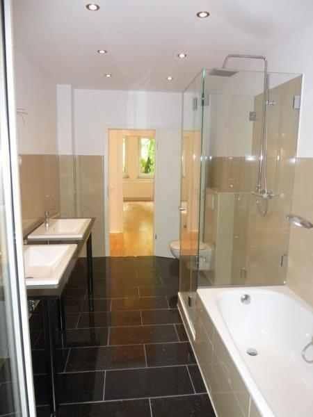 -Το πλήρες μπάνιο με 2 νιπτήρες, μπανιέρα και ντους μει πρόσβαση στη βεράντα. Το δάπεδο έχει τοποθετηθεί με την υψηλή ποιότητα φυσική πέτρα.