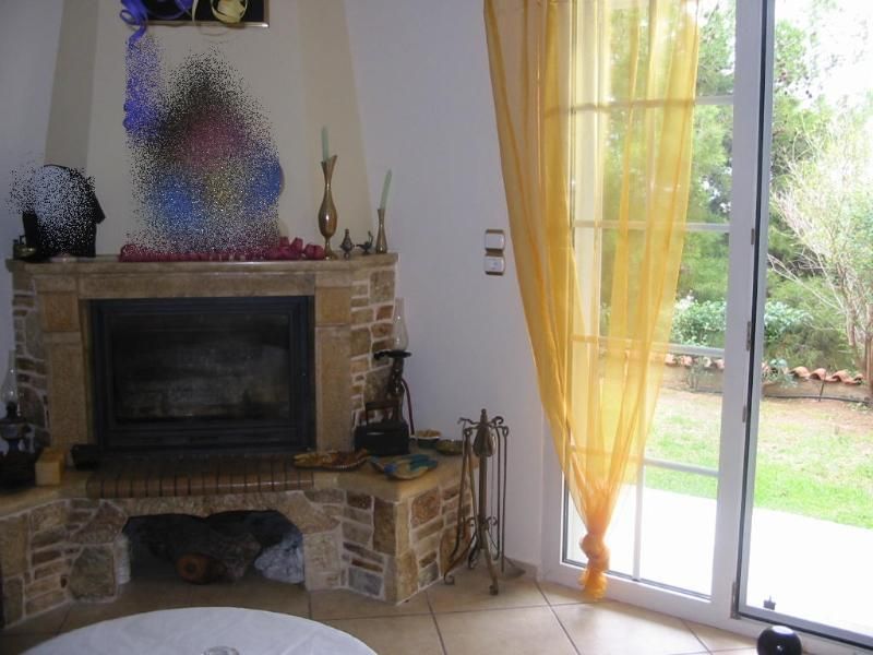 1 καθιστικό με τζάκι , δάπεδο πλακάκι Terracota , ταβάνι επένδυση ξύλο