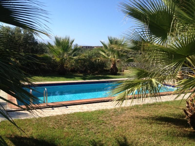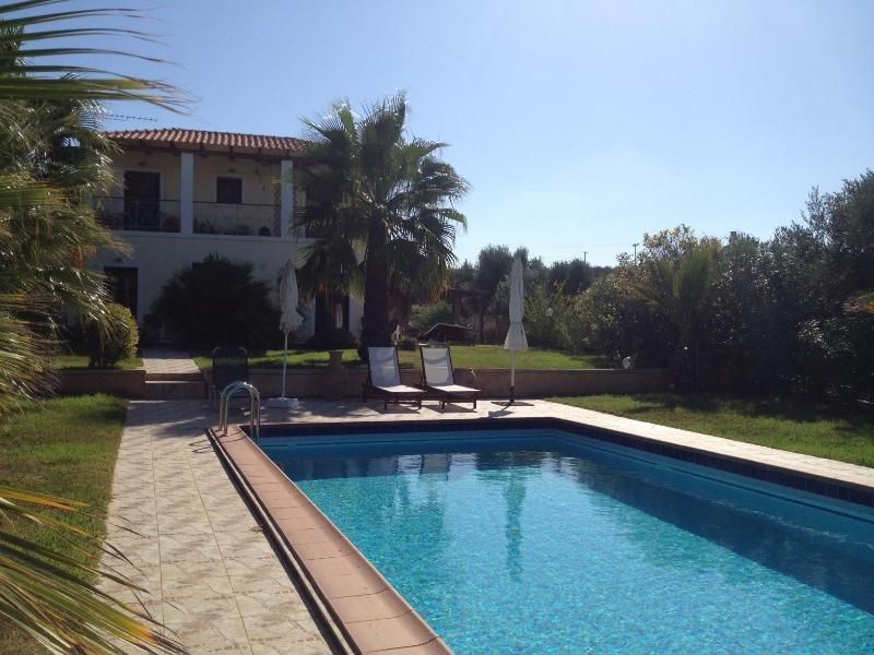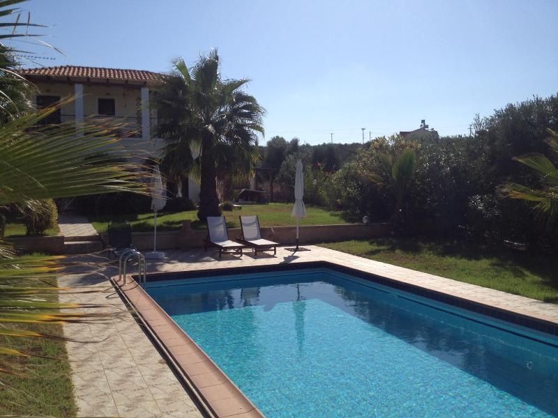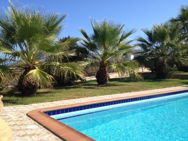 Οι εξωτερικοί χώροι είναι πλήρως διαμορφωμένοι και διαθέτουν εκτάσεις με γκαζόν, φοίνικες και μια ποικιλία από δέντρα και φυτά φρούτων. Ένα μονοπάτι οδηγεί στην πισίνα με πλακόστρωτη περιοχή ηλιοθεραπείας. Η ιδιοκτησία περιβάλλεται από πέτρινες μάντρες