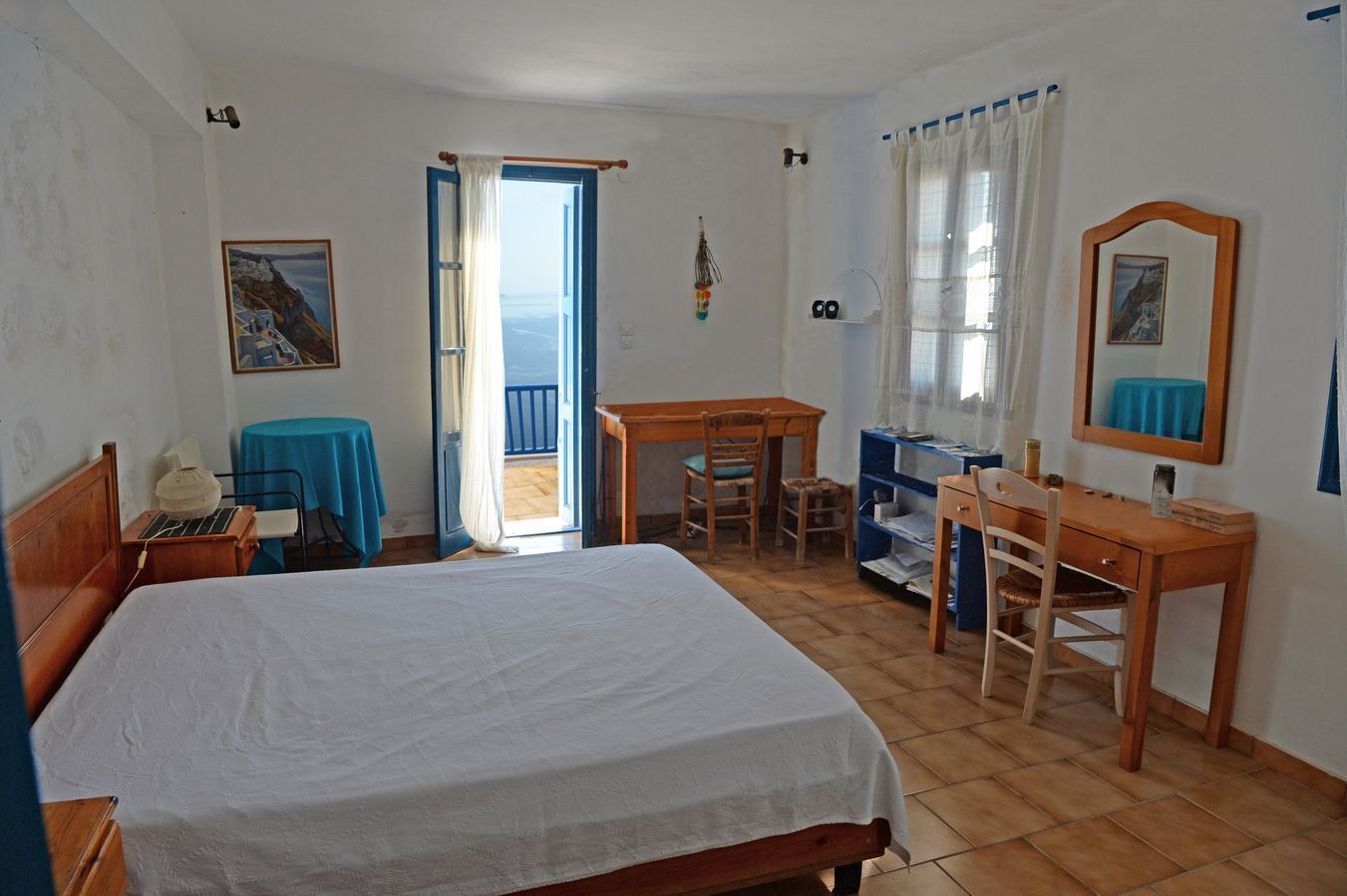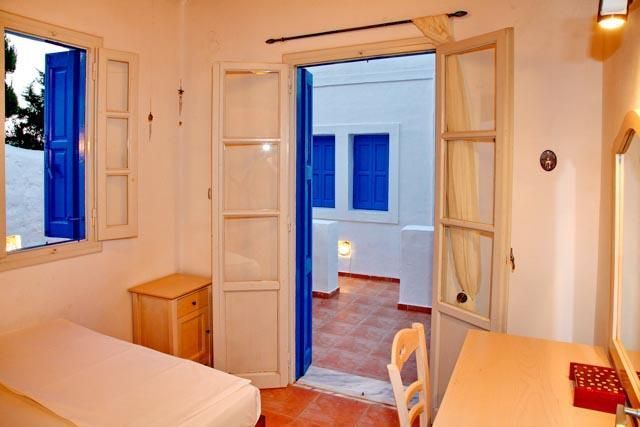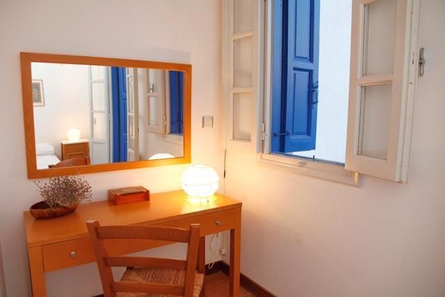 Οι πόρτες και τα παράθυρα είναι ξύλινα βαμμένα στο παραδοσιακό μπλέ χρώμα.