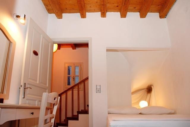 Οι οροφές διακοσμούνται από ξύλινες τραβέρσες ενώ οι εσωτερικές σκάλες είναι