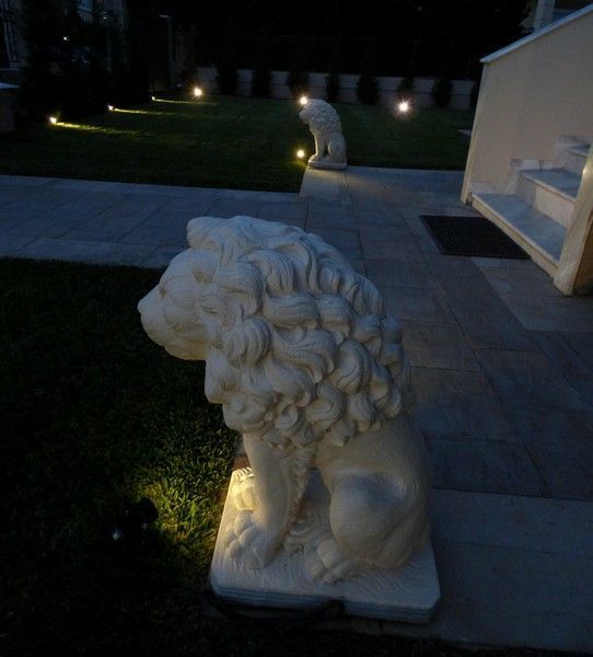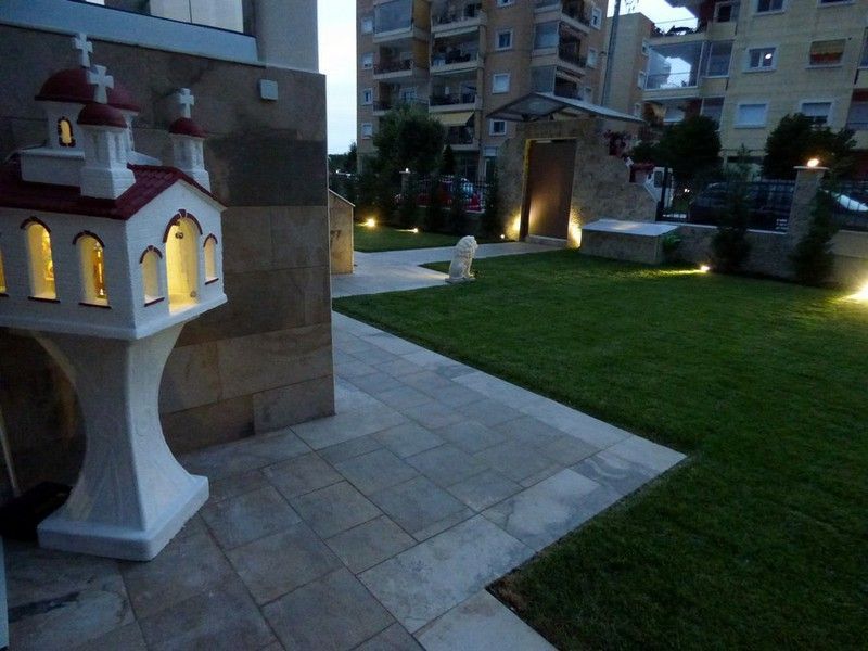 Η είσοδος στην αυλή είναι επενδυμένη με ομογενοποιημένη πέτρα και φέρει μεγάλες μεταλλικές πόρτες, (ανθρωποθυρίδα –γκαραζόπορτα), συμπαγείς που περιορίζουν στο έπακρο τα αδιάκριτα βλέμματα.