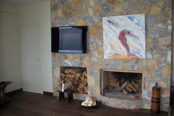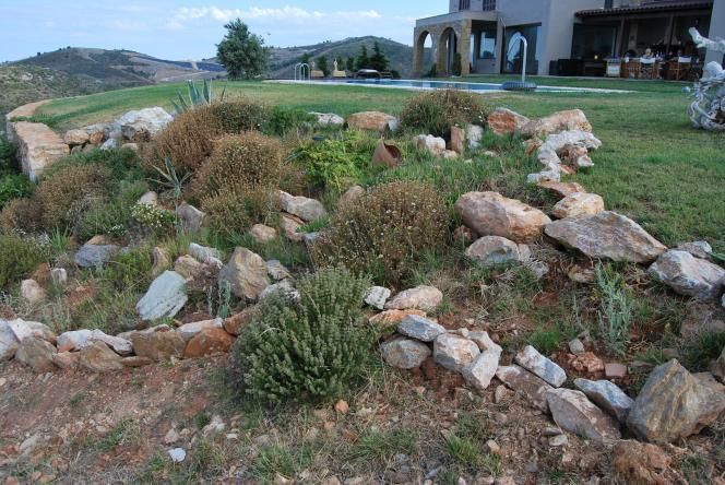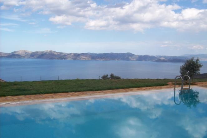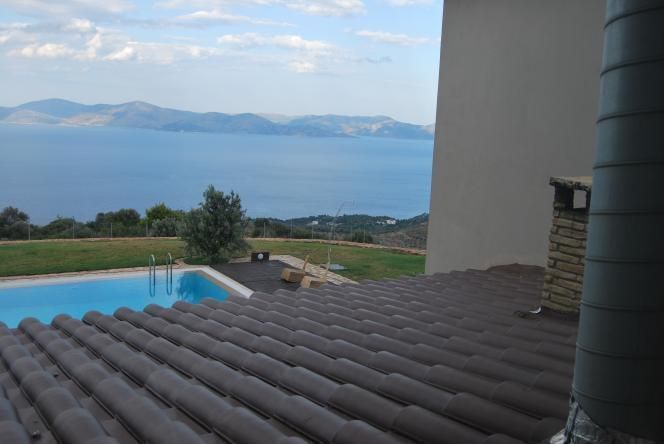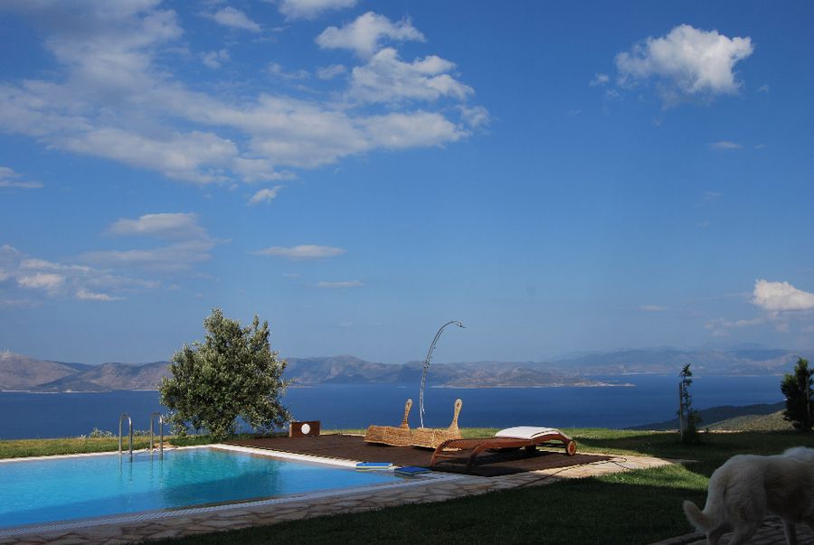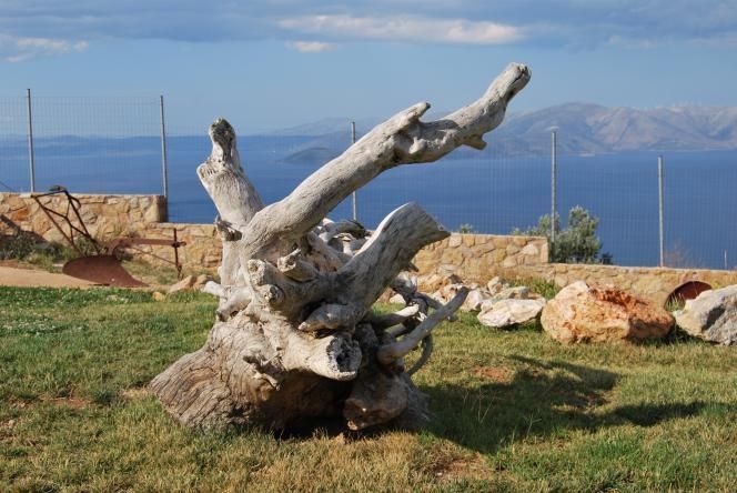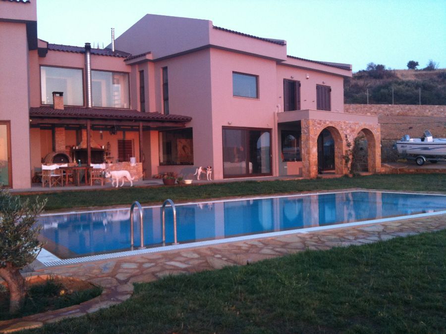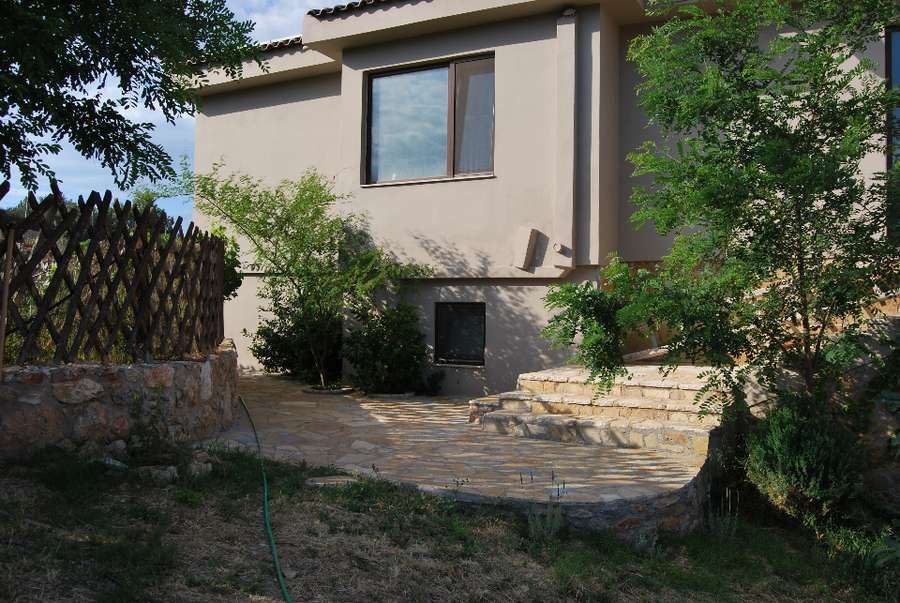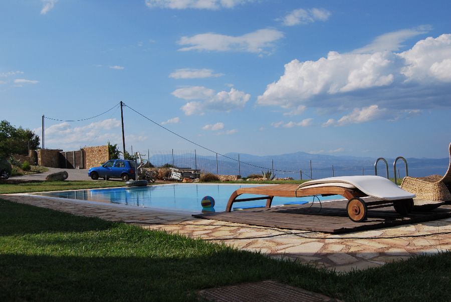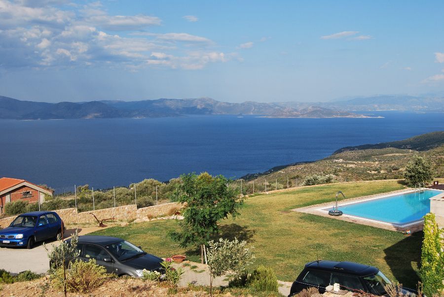 στην πλαγια του βουνου, σε επιφανεια οικοπεδου πεντε στρεμματων, με μοναδικη θεα στο νοτιο Ευβοικο κολπο, απο το Αλιβερι μεχρι στα νοτια Στειρα.