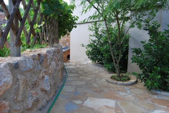 Ο ωραιος βραχοκηπος, λαχανοκηπος περιεχει ποικιλα δεντρα (καρυδιες, ελιες, βερυκοκιες κλπ). και περιβαλλεται απο εξακοσια 600 τ.μ. γκαζον.