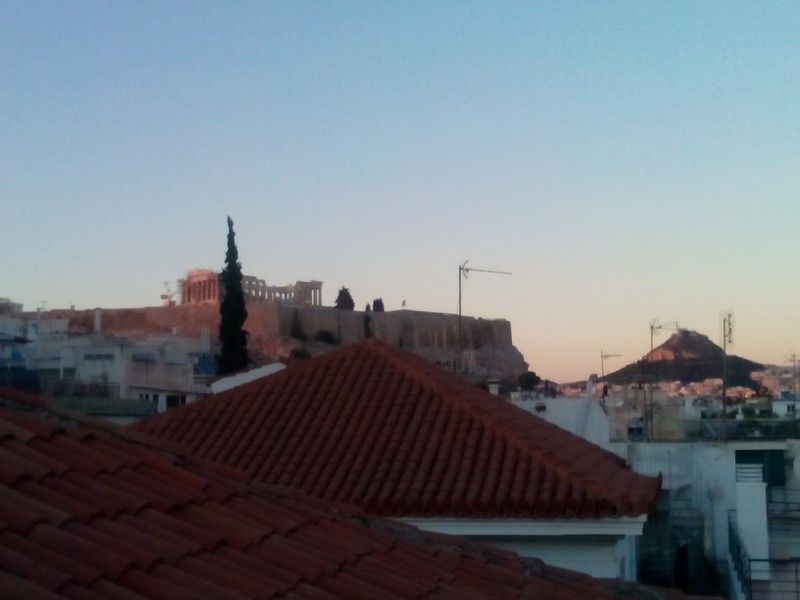 Από τον β' όροφο και την ταράτσα ατενιζει την Ακρόπολη, την θάλασσα και την λοιπή Αθήνα.