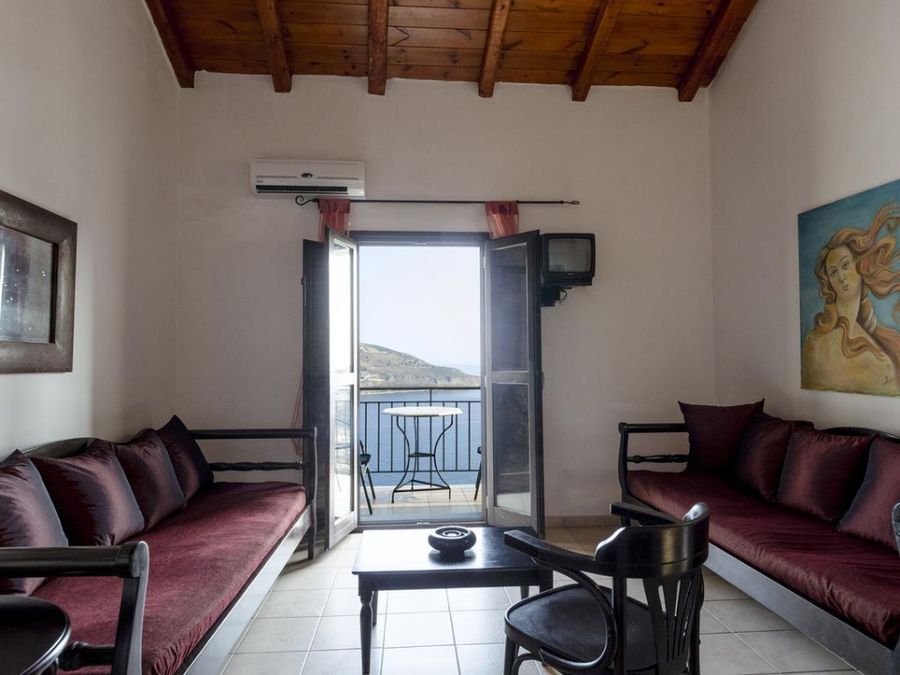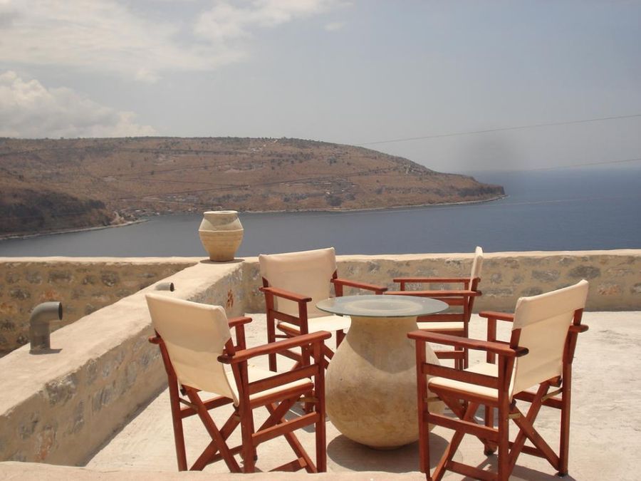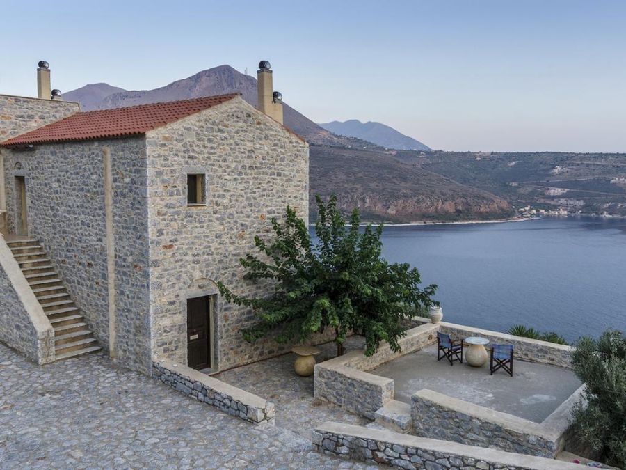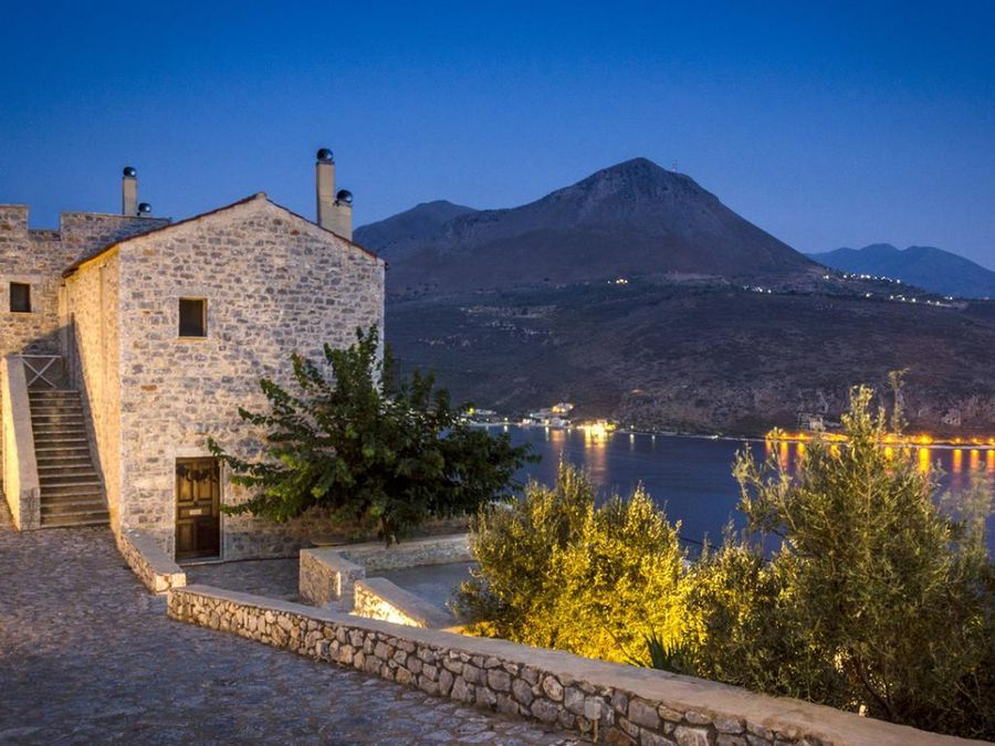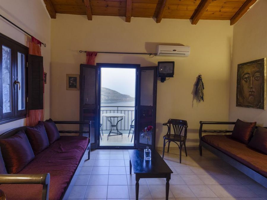 διακοσμημένα δωμάτια με τζάκι και επιπλωμένο μπαλκόνι με θέα στο Μεσσηνιακό Κόλπο.