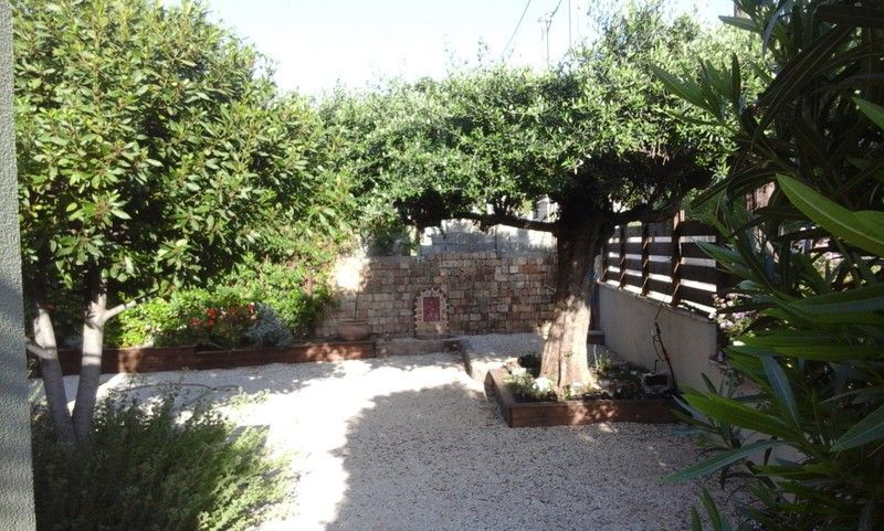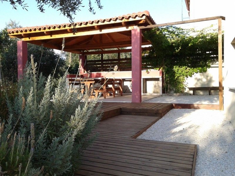 În jurul casei, mai multe etape duc la o grădină mediteraneană cu mai multe etaje, cu oleandru, levănțică, plante aromatice și măslini, mai multe pergole cu plante de alpinism, terase din lemn și scaune cu bănci din lemn încorporate și un chioșc pentru grătare, bucătărie și zonă de luat masa .